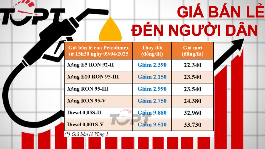 Vào 15h30 ngày 9/4, Bộ Công Thương đã công bố đợt điều chỉnh giá bán dành cho các loại xăng dầu theo đúng quy định, giá cơ sở của các mặt hàng hiện như sau: Xăng RON 95-III không cao hơn 23.543 đồng/lít (giảm 2.993 đồng/lít); xăng E5 RON 92-II không cao hơn 22.344 đồng/lít (giảm 2.393 đồng/lít); dầu diesel 0,05S không cao hơn 32.969 đồng/lít (giảm 9.872 đồng/lít) và dầu mazut không cao hơn 22.613 đồng/kg (giảm 1.658 đồng/kg).