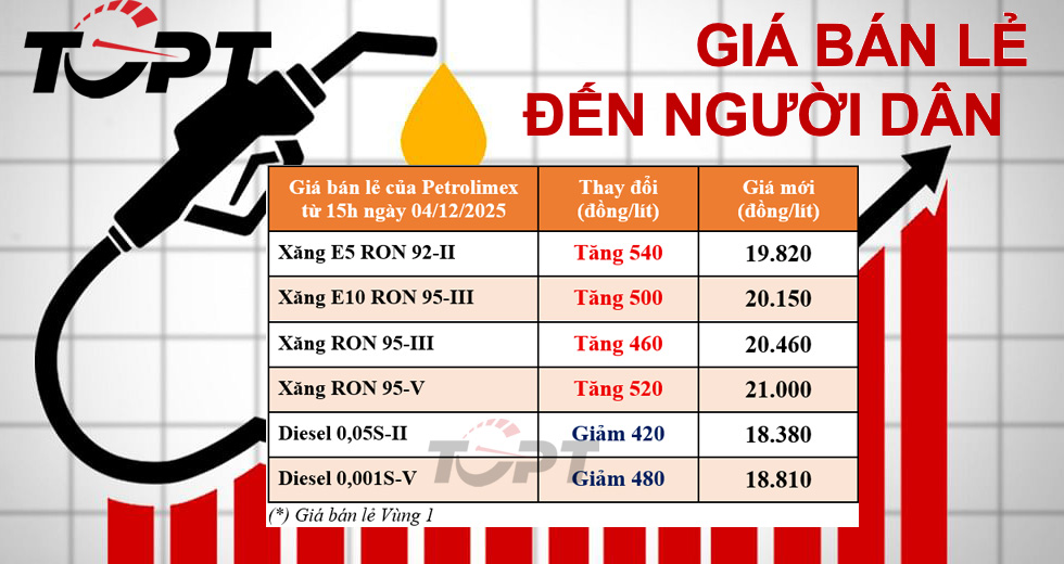 Vào 15h ngày 04/12, Bộ Công Thương đã công bố đợt điều chỉnh giá bán dành cho các loại xăng dầu theo đúng quy định, giá cơ sở của các mặt hàng hiện như sau: Xăng RON 95-III không cao hơn 20.460 đồng/lít (tăng 451 đồng/lít); xăng E5 RON 92-II không cao hơn 19.822 đồng/lít (tăng 534 đồng/lít); dầu diesel 0,05S không cao hơn 18.380 đồng/lít (giảm 420 đồng/lít), dầu hoả không cao hơn 18.893 đồng/lít (giảm 580 đồng/lít), và dầu mazut không cao hơn 13.436 đồng/kg (giảm 52 đồng/kg).
