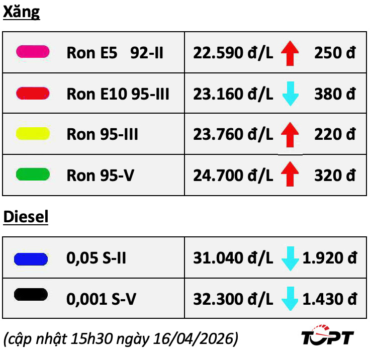 Vào 15h ngày 10/4, Bộ Công Thương đã công bố đợt điều chỉnh giá bán dành cho các loại xăng dầu theo đúng quy định, giá cơ sở của các mặt hàng hiện như sau: Xăng RON 95-III không cao hơn 19.207 đồng/lít (giảm 1.712 đồng/lít); xăng E5 RON 92 không cao hơn 18.882 đồng/lít (giảm 1.491 đồng/lít); dầu diesel 0,05S không cao hơn 17.243 đồng/lít (giảm 1.235 đồng/lít), dầu hoả không cao hơn 17.413 đồng/lít (giảm 1.322 đồng/lít), và dầu mazut không cao hơn 15.902 đồng/kg (giảm 1.124 đồng/kg).