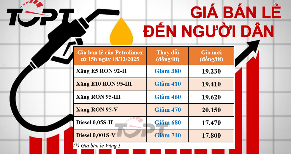 Vào 15h ngày 18/12, Bộ Công Thương đã công bố đợt điều chỉnh giá bán dành cho các loại xăng dầu theo đúng quy định, giá cơ sở của các mặt hàng hiện như sau: Xăng RON 95-III không cao hơn 19.620 đồng/lít (giảm 462 đồng/lít); xăng E5 RON 92-II không cao hơn 19.239 đồng/lít (giảm 376 đồng/lít); dầu diesel 0,05S không cao hơn 17.476 đồng/lít (giảm 678 đồng/lít), dầu hoả không cao hơn 17.937 đồng/lít (giảm 704 đồng/lít), và dầu mazut không cao hơn 13.160 đồng/kg (giảm 233 đồng/kg).