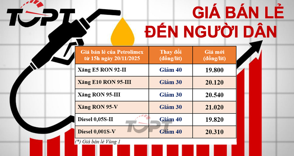 Vào 15h ngày 20/11, Bộ Công Thương đã công bố đợt điều chỉnh giá bán dành cho các loại xăng dầu theo đúng quy định, giá cơ sở của các mặt hàng hiện như sau: Xăng RON 95-III không cao hơn 20.542 đồng/lít (giảm 34 đồng/lít); xăng E5 RON 92-II không cao hơn 19.807 đồng/lít (giảm 37 đồng/lít); dầu diesel 0,05S không cao hơn 19.826 đồng/lít (giảm 38 đồng/lít), dầu hoả không cao hơn 20.288 đồng/lít (tăng 353 đồng/lít), và dầu mazut không cao hơn 13.739 đồng/kg (giảm 335 đồng/kg).