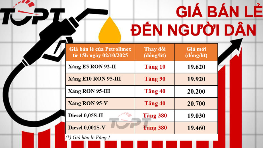 Vào 15h ngày 2/10, Bộ Công Thương đã công bố đợt điều chỉnh giá bán dành cho các loại xăng dầu theo đúng quy định, giá cơ sở của các mặt hàng hiện như sau: Xăng RON 95-III không cao hơn 20.209 đồng/lít (tăng 44 đồng/lít); xăng E5 RON 92-II không cao hơn 19.624 đồng/lít (tăng 6 đồng/lít); dầu diesel 0,05S không cao hơn 19.038 đồng/lít (tăng 380 đồng/lít), dầu hoả không cao hơn 19.005 đồng/lít (tăng 377 đồng/lít), và dầu mazut không cao hơn 15.370 đồng/kg (tăng 161 đồng/kg).