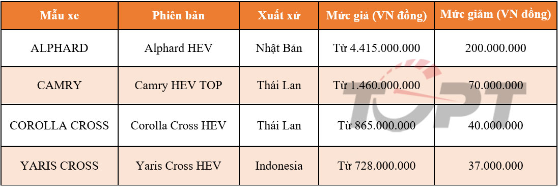 Theo đó, Alphard HEV có mức giảm cao nhất tới 200 triệu đồng; đáng chú ý, mẫu xe Camry sẽ chỉ được điều chỉnh giá bán ở phiên bản HEV TOP trong khi HEV MID giữ giá cũ; cùng với hai mẫu xe còn lại cũng được giảm giá gồm Corolla Cross HEV và Yaris Cross HEV.