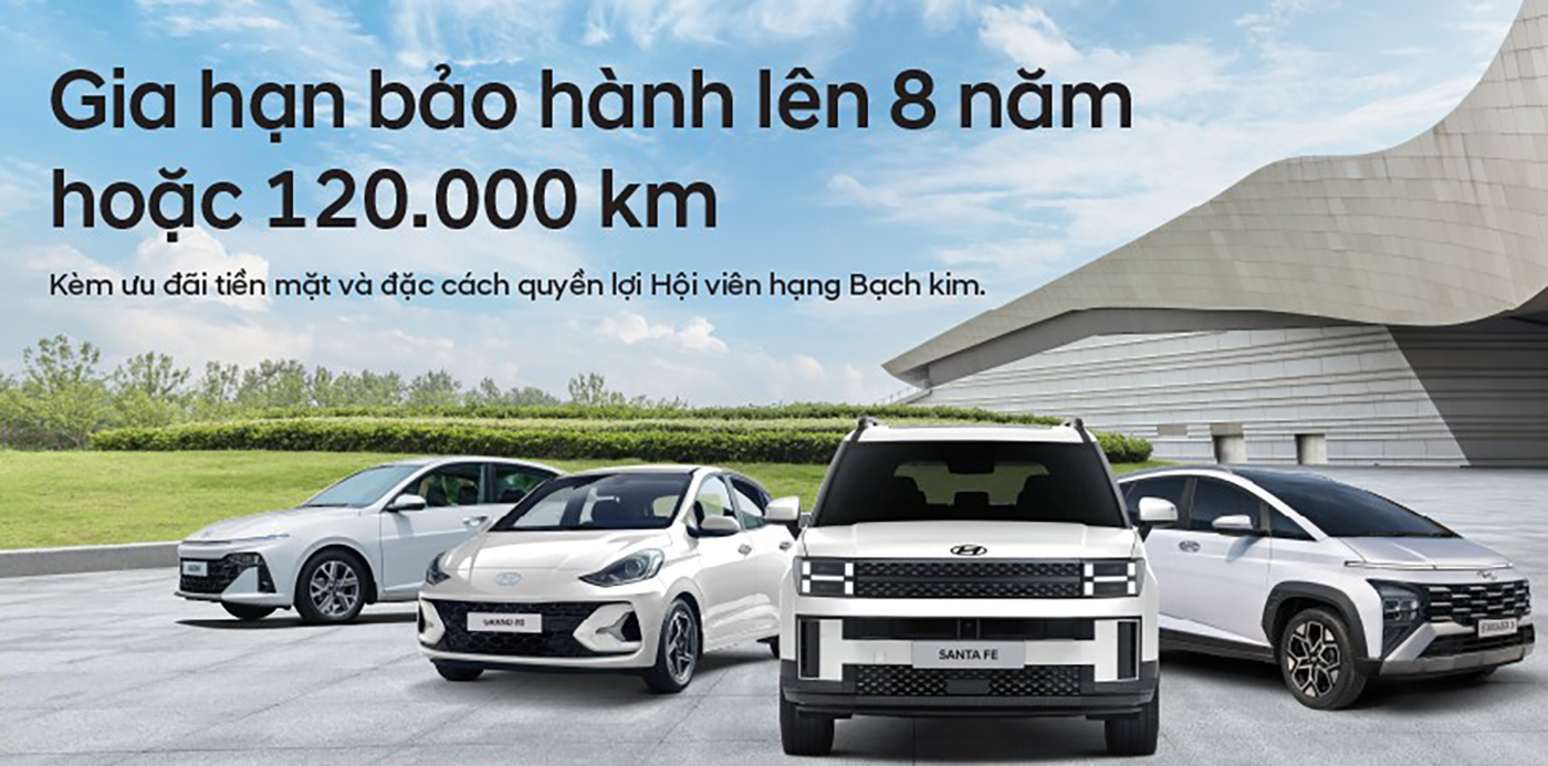 Điểm nhấn mang tính đột phá và dẫn đầu thị trường là chế độ bảo hành 8 năm/120.000 km (tùy điều kiện nào đến trước), áp dụng cho bốn mẫu xe quan trọng: Hyundai Santa Fe, Hyundai Accent, Hyundai Stargazer và Hyundai Grand i10.