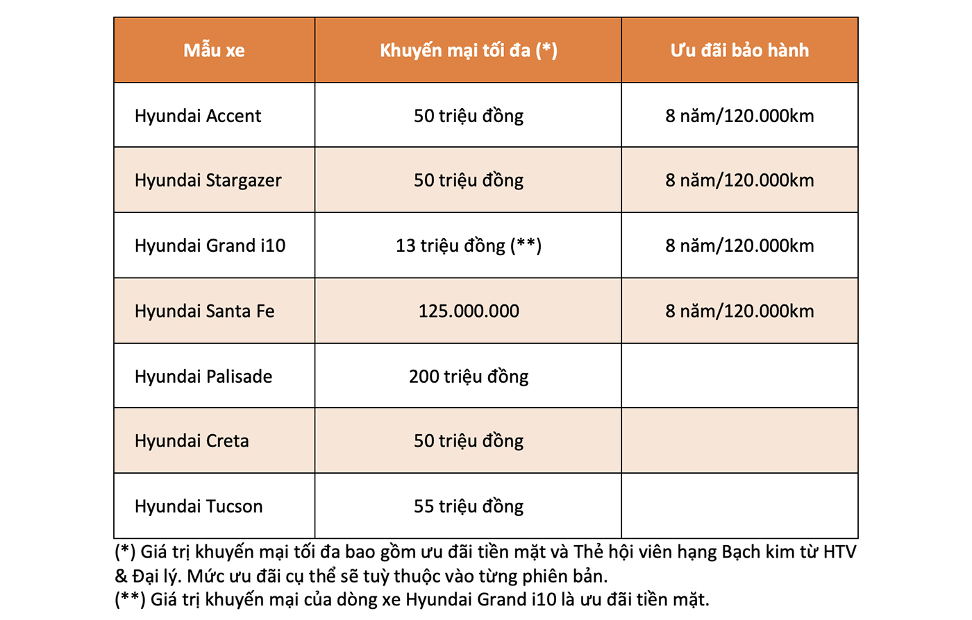 Hyundai Thành Công kết hợp cùng các đại lý tưng ra các mức ưu đãi cho một số dòng xe "chủ lực", với mức tối đa 200 triệu đồng