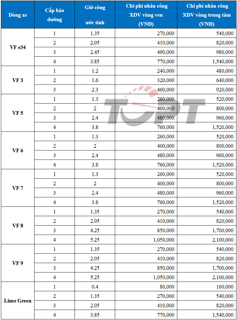 Chi phí nhân công dịch vụ bảo dưỡng định kỳ ở Hà Nội và TP. Hồ Chí Minh dành cho từng hạng mục và mẫu xe: