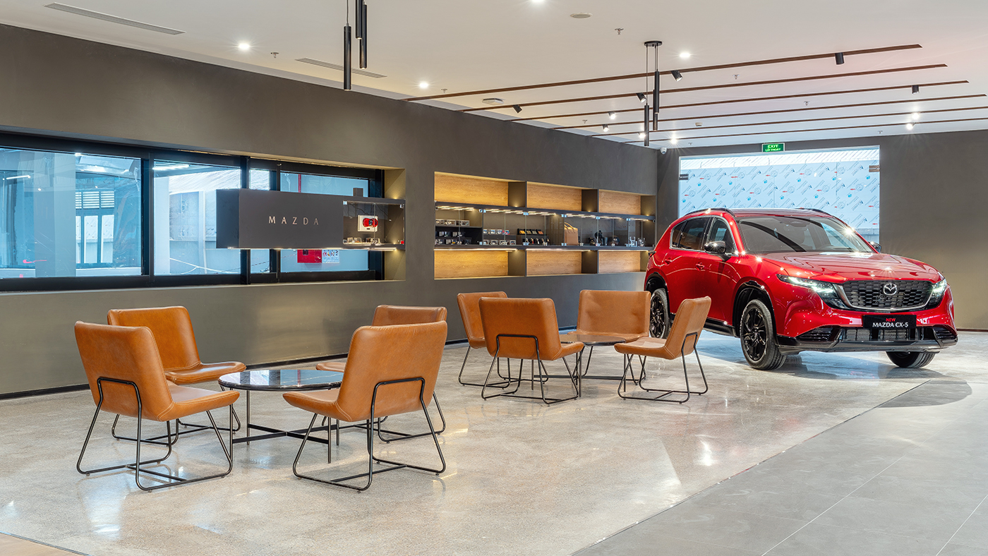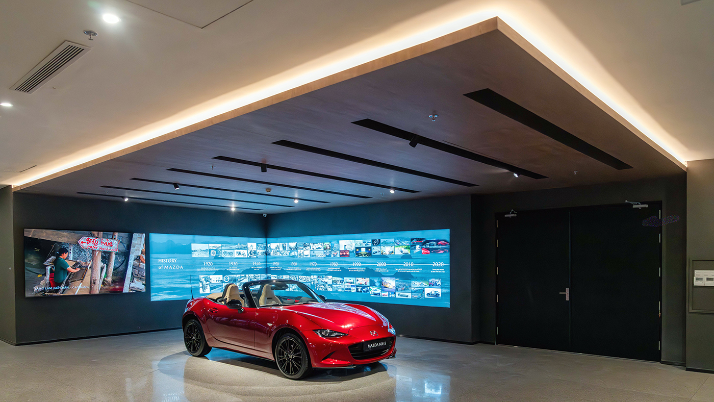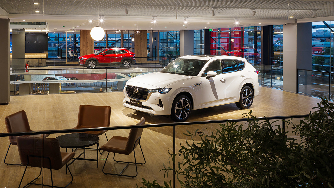 Dựa trên triết lý “Connecting – Kết nối”, không gian showroom được thiết kế mở, hòa mình vào thiên nhiên thay vì tách biệt với đô thị. Điểm nhấn nằm ở hệ lam chắn nắng (louvers) tạo hiệu ứng bóng đổ thay đổi theo thời gian, giúp tòa nhà như một thực thể sống động. Bên trong, thay vì chỉ là nơi mua bán, khách hàng được trải nghiệm một hệ sinh thái dịch vụ hoàn chỉnh: từ khu trưng bày xe thế hệ mới, khu triển lãm di sản (Mazda History), đến các khu vực cao cấp như Sky Lounge và xưởng dịch vụ 3 tầng ứng dụng số hóa toàn diện.