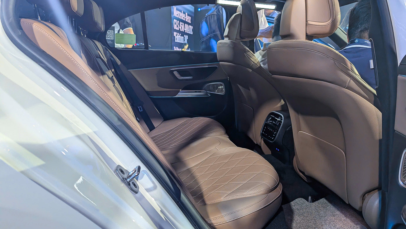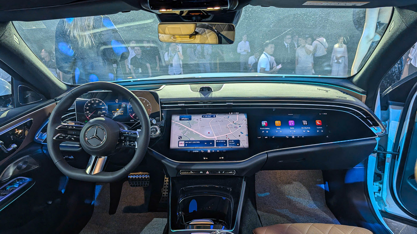 Khoang nội thất của E-Class thế hệ mới được thay đổi về thiết kế bảng táp-lô, với màn hình đồng hồ kỹ thuật số 12,3 inch kết hợp màn hình trung tâm 14,4 inch, hệ thống định vị MBUX Navigation Plus, ốp gỗ tần bì màu đen với đèn nền và họa tiết ngôi sao. Phiên bản E 200 Exclusive bổ sung da Artico và ốp gỗ phong, chức năng thông gió cho ghế trước, hệ thống lọc không khí và bụi bẩn, hệ thống âm thanh vòm Burmester 4D với 17 loa.