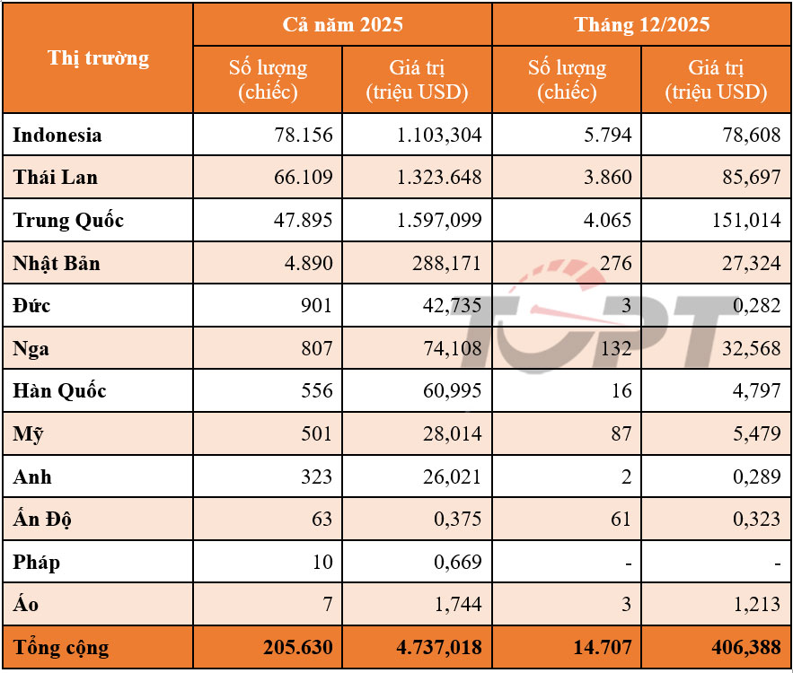 Indonesia dẫn đầu về số lượng xe xuất khẩu vào Việt Nam trong năm 2025.