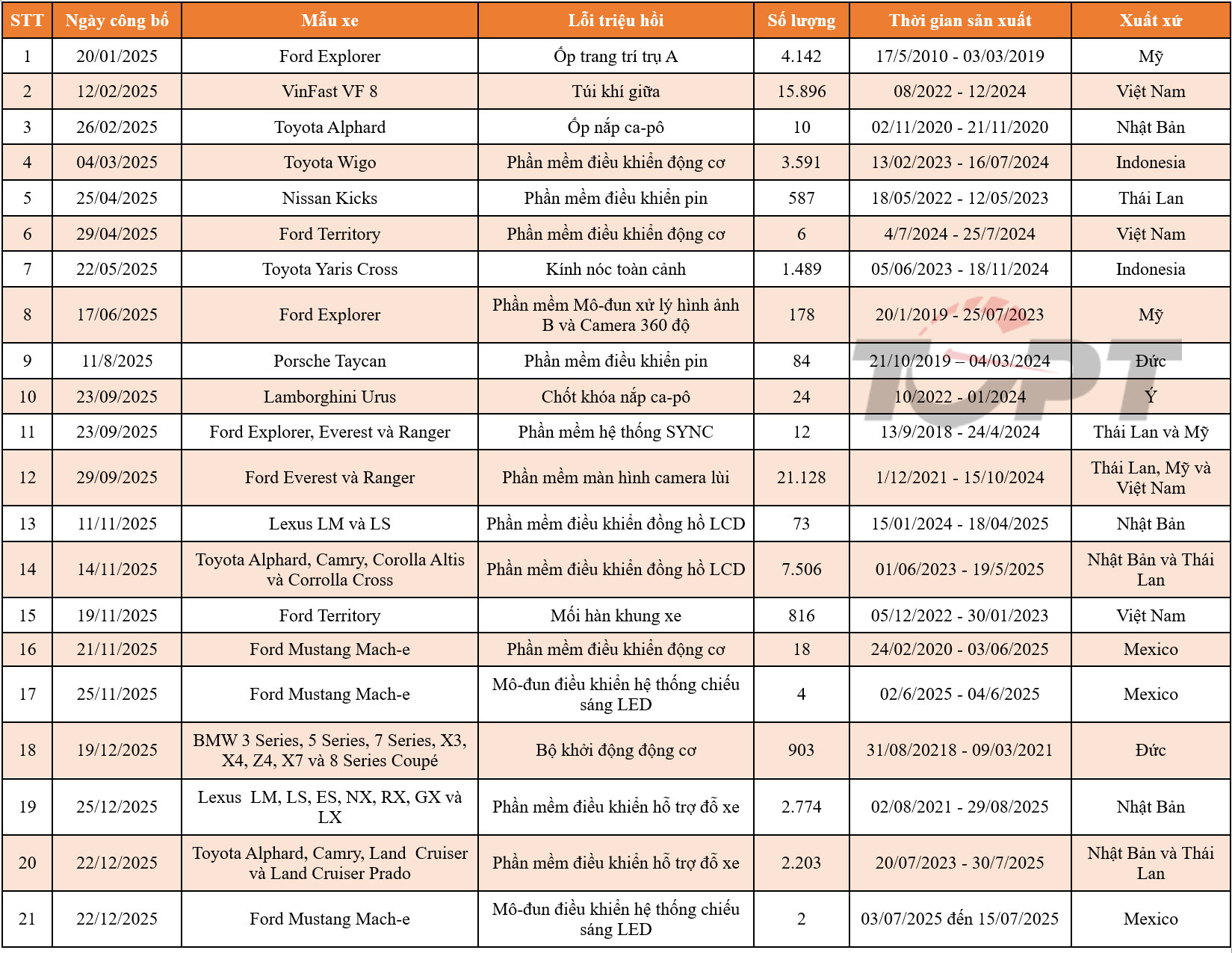Các đợt triệu hồi tại Việt Nam trong năm 2025 tổng hợp từ Cục Đăng kiểm Việt Nam.