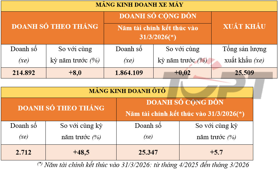 Tính trong năm tài chính kết thúc vào ngày 31/3/2026 (từ tháng 4/2025 đến tháng 3/2026), HVN cũng ghi nhận tổng doanh số tới hơn 1,86 triệu xe máy tại thị trường trong nước, tăng nhẹ 0,02% so với cùng kỳ năm ngoái.