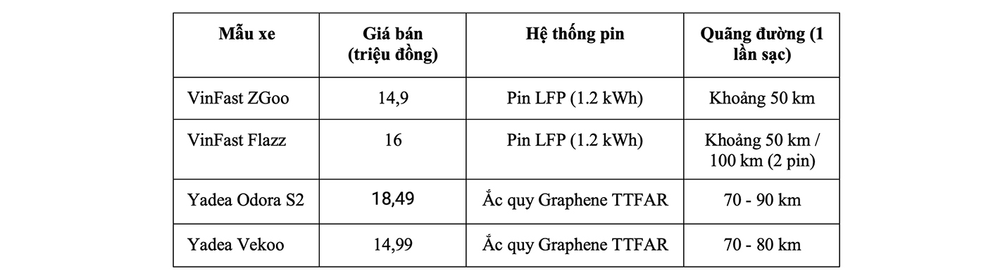 Với mức giá khởi điểm chỉ từ 14,9 triệu đồng, VinFast ZGoo và Flazz cạnh tranh trực tiếp về giá với các mẫu xe số chạy xăng phổ thông và các xe máy điện cùng phân khúc (thường sử dụng ắc-quy axit chì). Sự khác biệt lớn nhất là việc VinFast phổ cập công nghệ pin LFP an toàn ngay ở phân khúc giá rẻ, tạo ra lợi thế cạnh tranh rõ rệt.