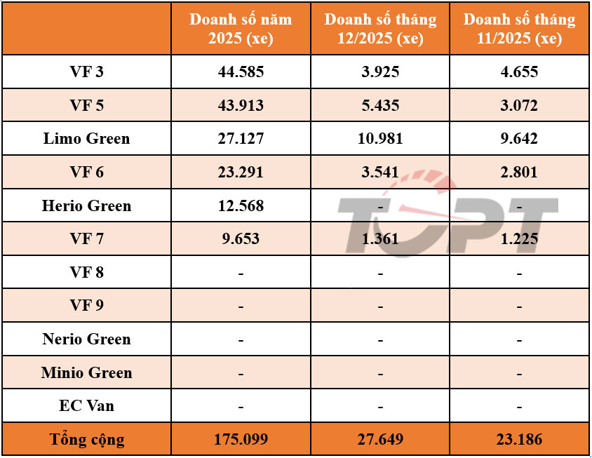 Doanh số các mẫu xe VinFast trong năm 2025.