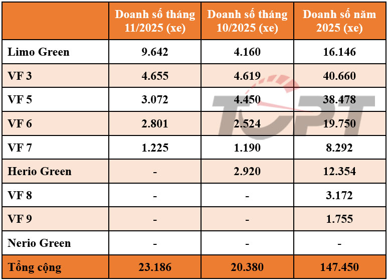 Chi tiết doanh số các mẫu xe được VinFast công bố trong tháng 11/2025.