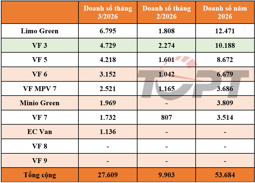 Doanh số chi tiết các mẫu xe VinFast trong tháng 3/2026.