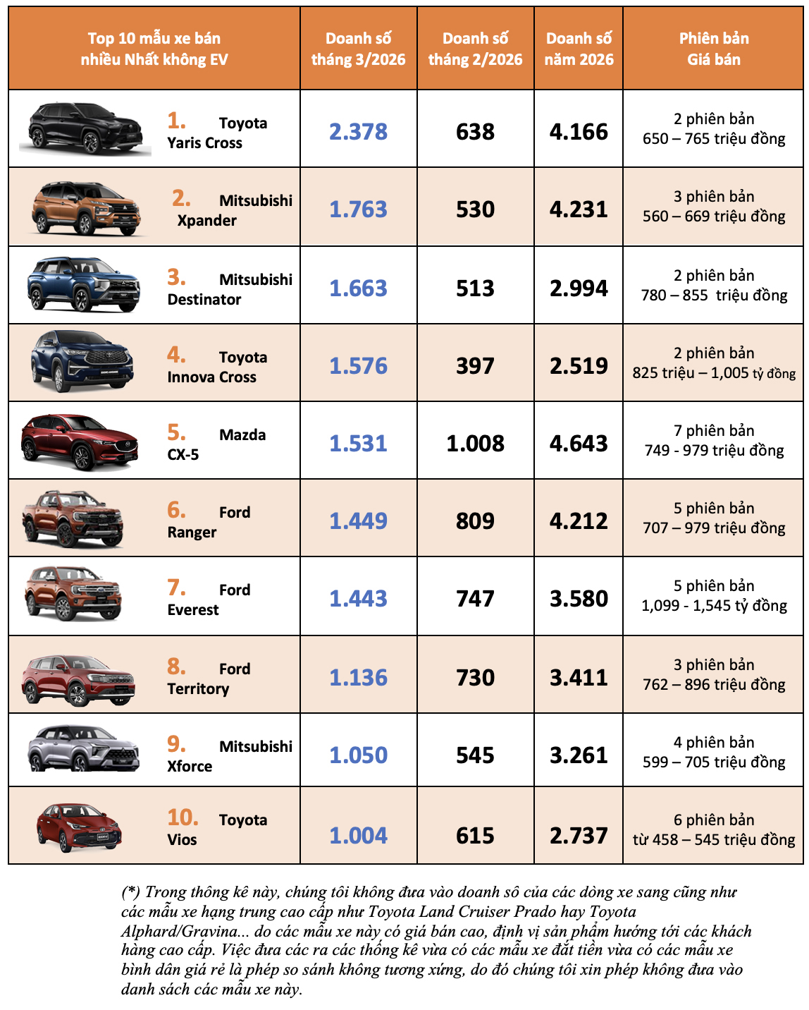 Ngoài ra, danh sách này còn có hai mẫu xe khác thuộc thương hiệu Toyota là Innova Cross với 1.576 chiếc và Corolla Cross với 951 chiếc. Tương tự, Mitsubishi cũng có ba đại diện xuất hiện; bên cạnh Xpander còn lại Destinator với 1.663 chiếc và Xforce với 1.050 chiếc.