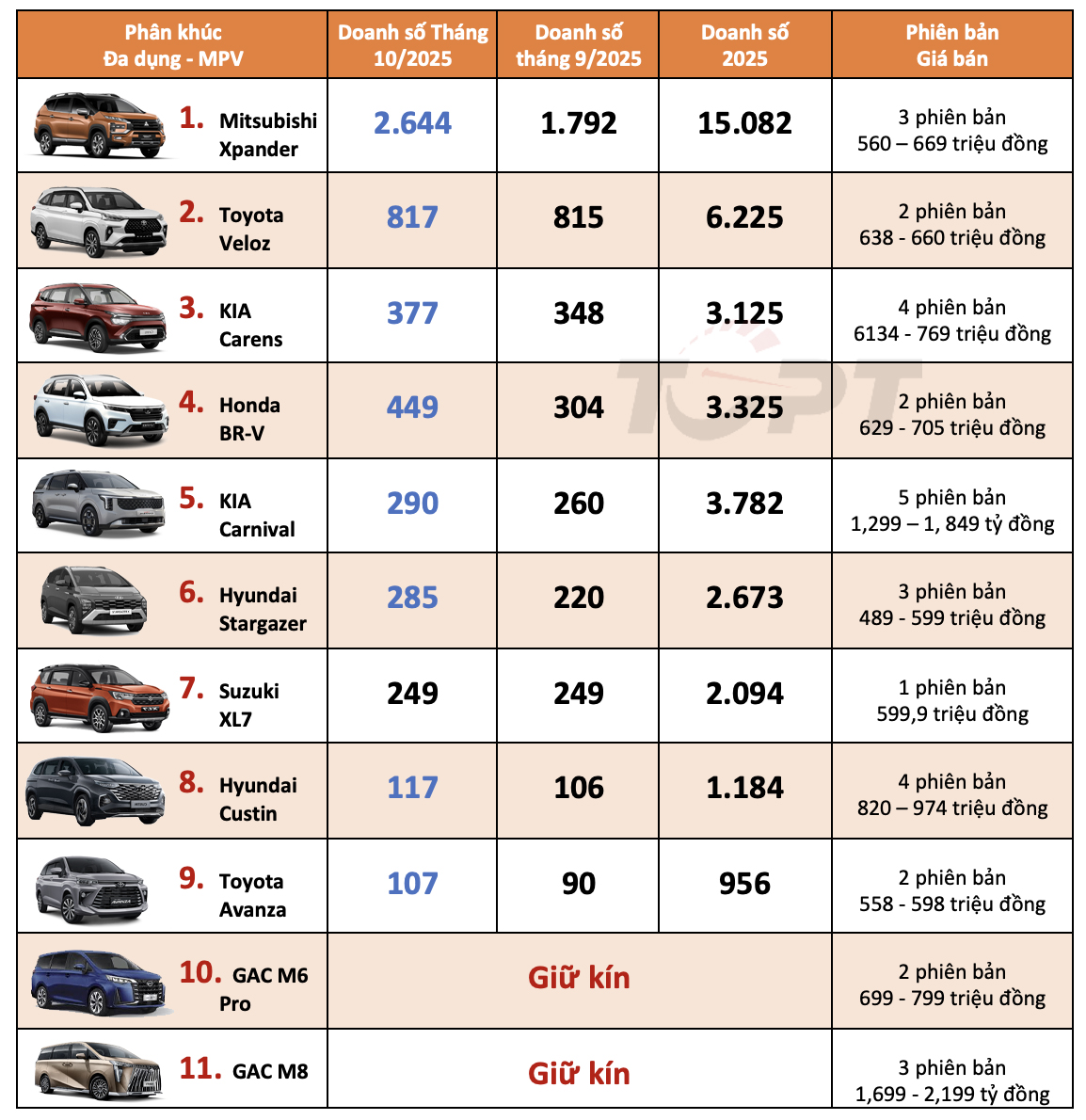 Phân khúc MPV tại Việt Nam trong tháng 10/2025 đều tăng doanh số, cá biệt duy nhất có mẫu XL7 giữ nguyên mức gần 250 xe bán ra.