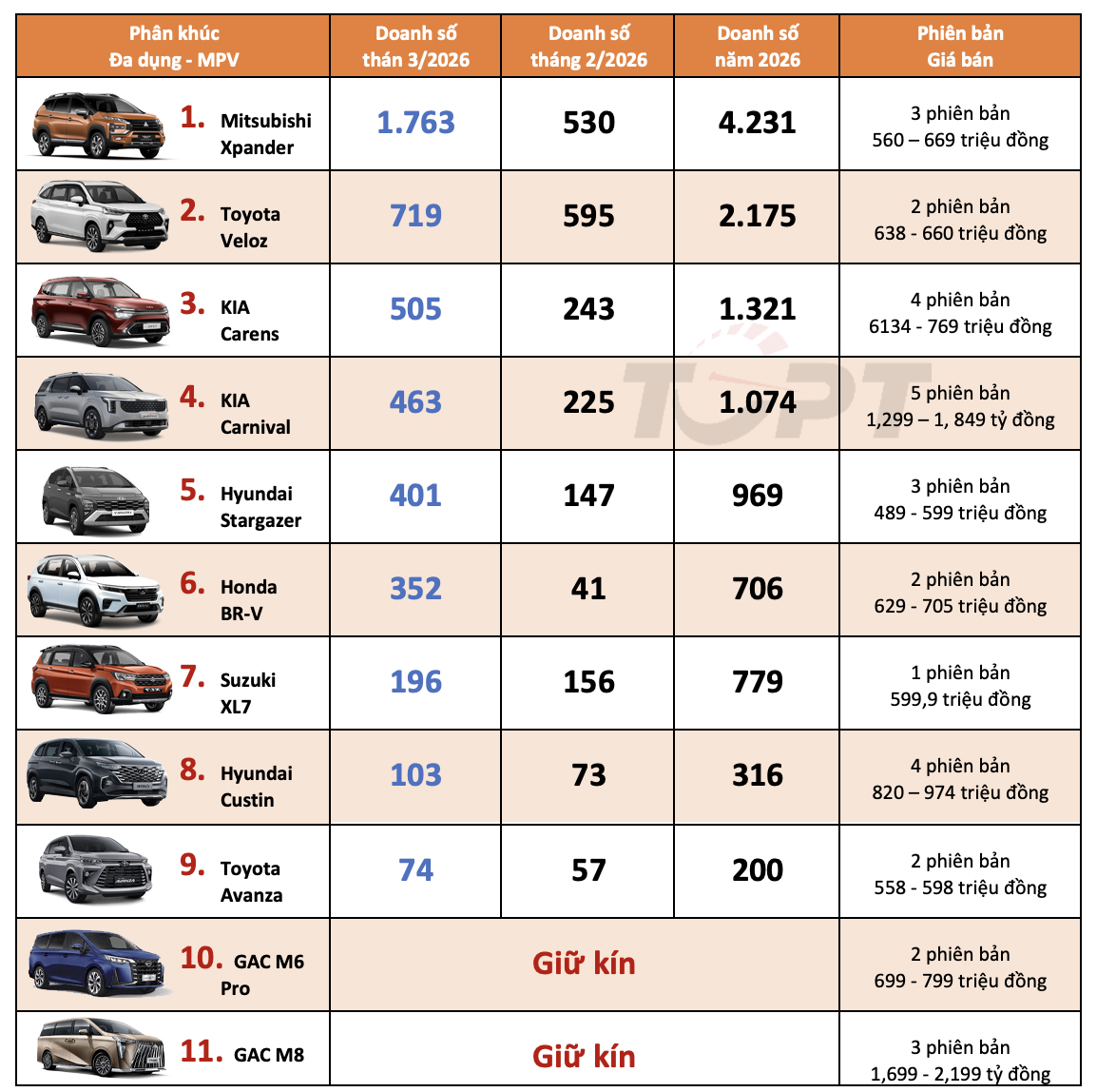 Toyota Veloz đã tụt xuống vị trí thứ hai quen thuộc dù có mức tăng trưởng so với tháng 2/2026, nhưng chênh lệch doanh số hơn 1.000 chiếc so với Mitsubishi Xpander là rất khó cho đại diện Toyota. Hai vị trí tiếp theo vẫn thuộc về bộ đôi Carens và Carnival của KIA khi có thể duy trì được mức tăng trưởng doanh số tốt, cao hơn 2 lần so với tháng trước đó.