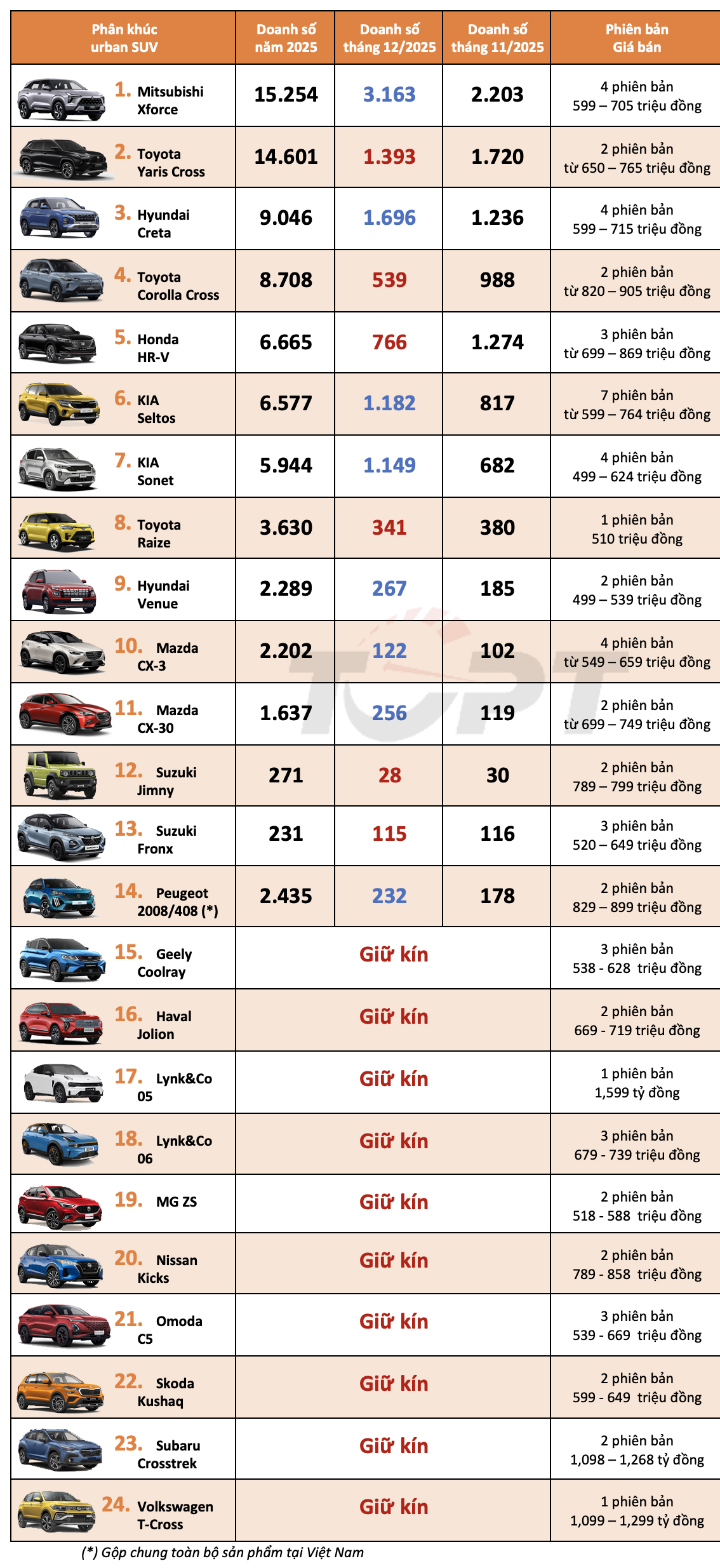 Phân khúc SUV đô thị có thêm nhiều mẫu xe mới gia nhập trong năm 2025 vừa qua nhưng hầu hết đều từ Trung Quốc và không công bố chi tiết doanh số. Trong khi đó, Suzuki Fronx được bán ra trong vài tháng cuối năm nên việc chỉ đứng ở cuối danh sách là điều khá dễ hiểu.