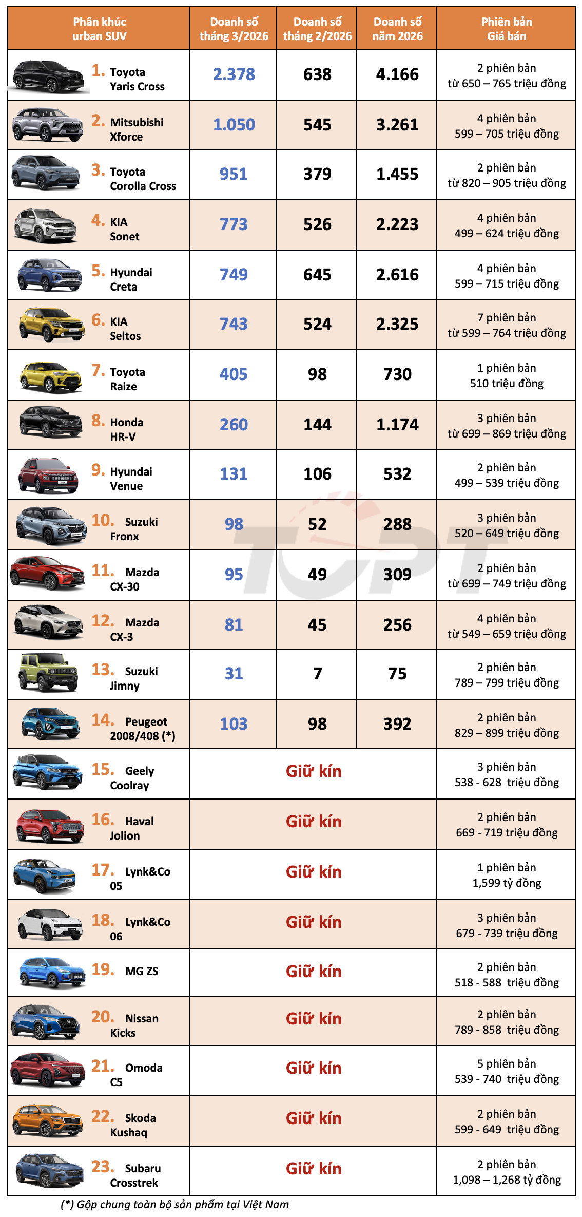 Thị trường ô tô Việt Nam: Phân khúc Urban SUV tháng 3/2026 - Toyota Yaris Cross bán gấp đôi Xforce