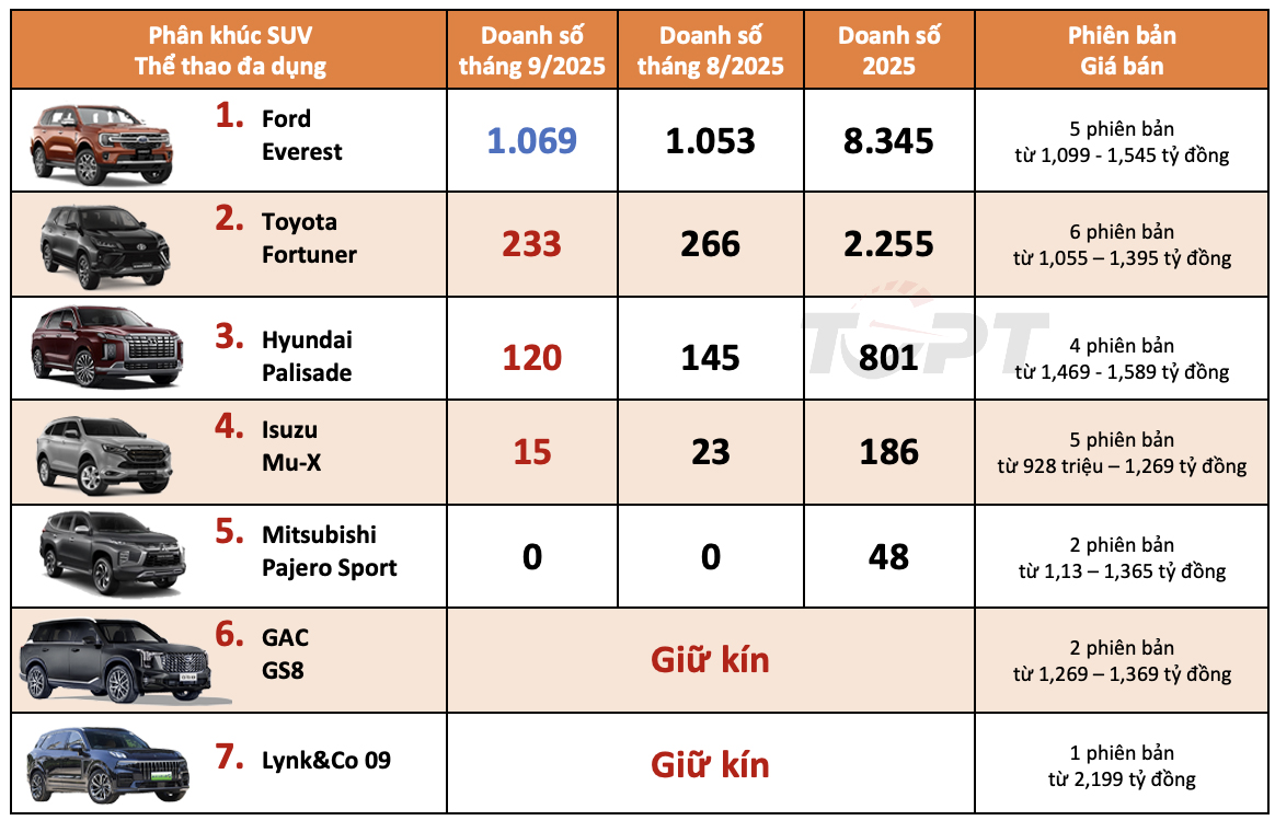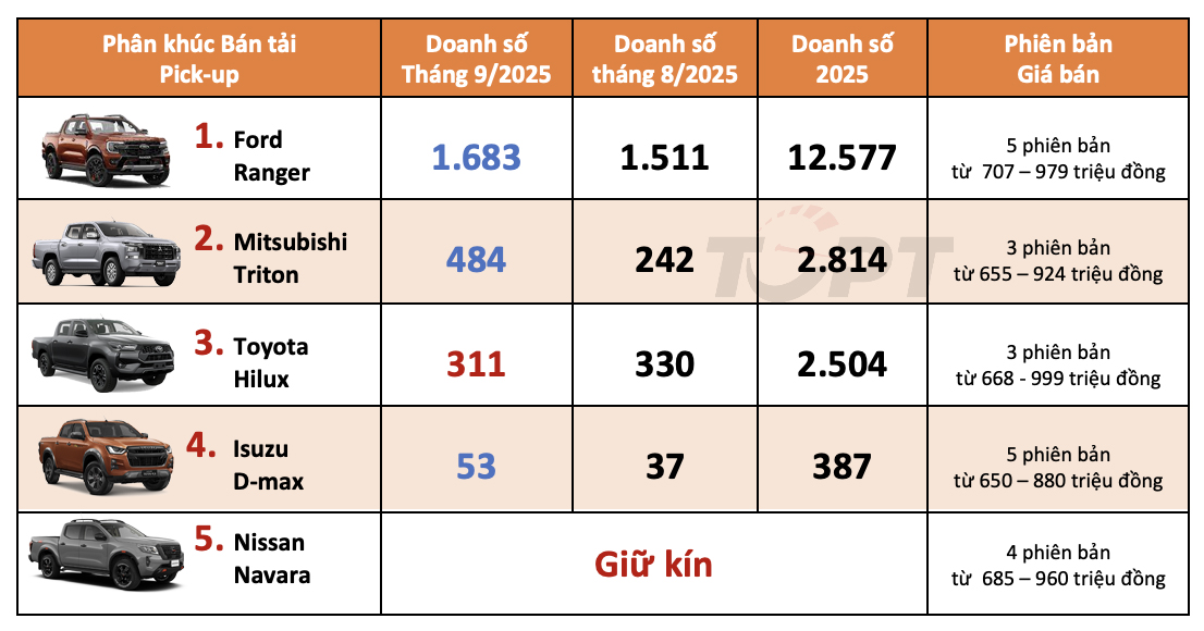 - Thị trường ô tô Việt Nam: Top 10 mẫu xe bán nhiều nhất tháng 9/2025 - Không bao gồm xe điện VinFast