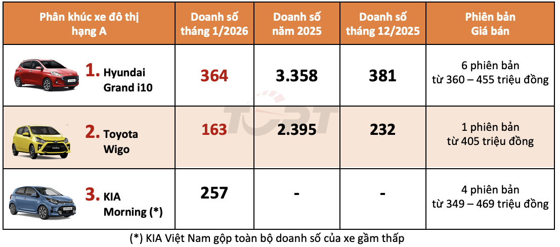 Phân khúc xe đô thị hạng A trong tháng 1 vừa qua không có thay đổi ở vị trí dẫn đầu, khi Hyundai Grand i10 tiếp tục thống trị với số lượng bán ra đạt 364 chiếc, vượt trội so với đối thủ còn lại.