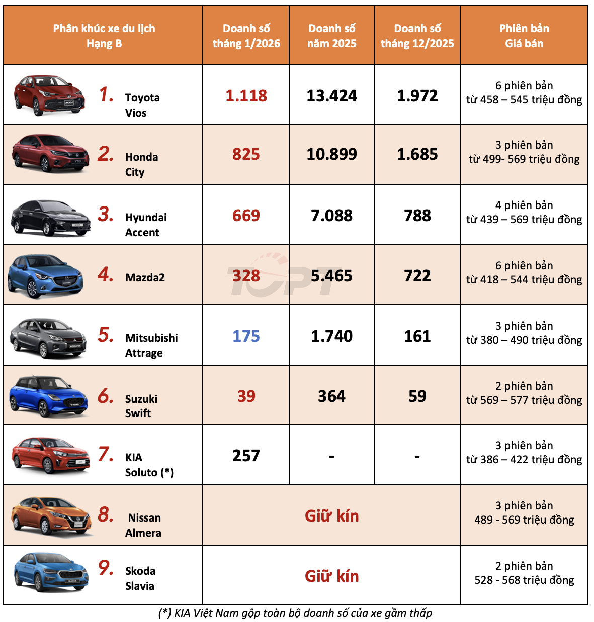 Trong tháng 1, phân khúc xe du lịch hạng B cũng ghi nhận mức giảm doanh số đồng loạt của nhiều mẫu xe tương tự xu hướng chung của thị trường. Toyota Vios dẫn đầu với 1.118 chiếc, tương tự với trường hợp của Honda City khi chỉ có 825 chiếc được giao đến tay khách hàng.