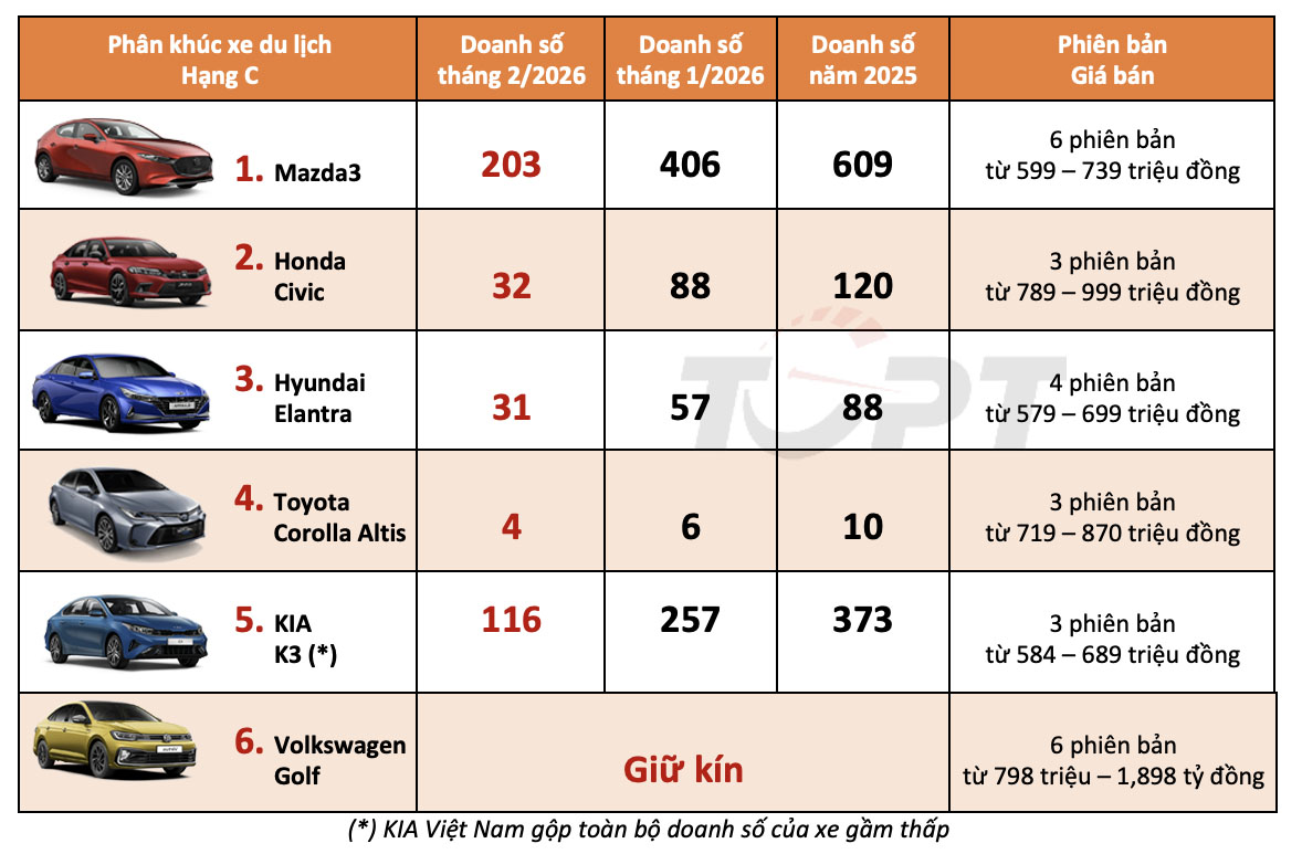 Phân khúc xe hạng C không có thay đổi nào về vị trí xếp hạng trong tháng 2 vừa qua, Mazda3 tiếp tục thể hiện sức hút tốt và dẫn đầu với doanh số đạt 203 chiếc, bằng một nửa của tháng trước đó. Honda Civic có mức giảm mạnh nhất phân khúc nhưng vẫn giữ được doanh số nhiều hơn 1 chiếc so với Hyundai Elantra, nên duy trì được vị trí số 2.