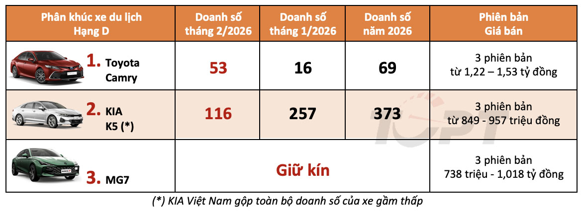 Phân khúc xe hạng D hiện chỉ còn duy nhất Toyota Camry được công bố cụ thể doanh số, mẫu xe này bất ngờ cho thấy mức tăng trưởng mạnh so với tháng trước đó, phần lớn đến từ các phiên bản Hybrid. KIA K5 hiện chỉ còn bán nhỏ giọt và được gộp doanh số với tất cả các xe gầm thấp của KIA nên khó có thể so sánh với đối thủ.