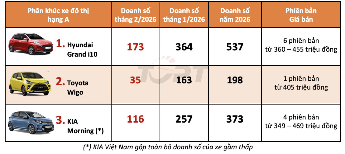 Trong tháng 2, phân khúc xe hạng A đồng loạt giảm doanh số, nhưng vẫn tiếp tục thống trị bởi Hyundai Grand i10 khi xe duy trì được 173 chiếc bán ra thị trường, trong khi Toyota Wigo có mức sụt giảm mạnh xuống chỉ còn 35 chiếc. KIA Việt Nam đã gộp toàn bộ doanh số xe gầm thấp nhưng vẫn thấp hơn so với mẫu xe Hyundai do phải chịu cảnh giảm hơn một nửa doanh số trong tháng vừa qua.