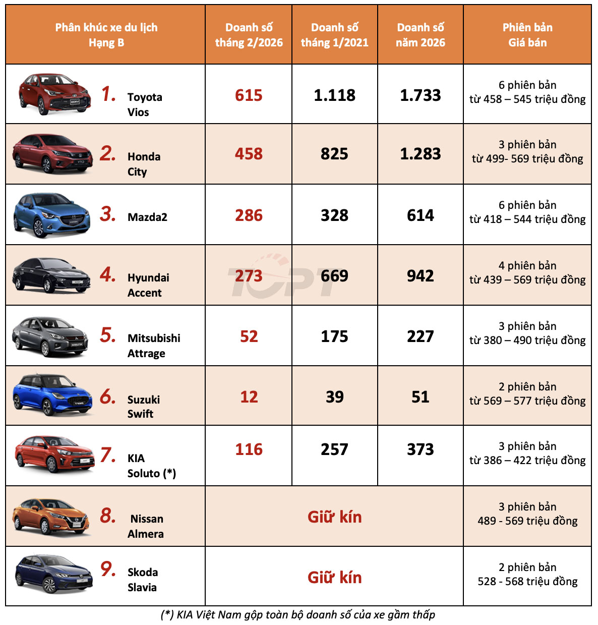 • Phân khúc xe hạng B tiếp tục được thống trị bởi Toyota Vios nhưng có một số thay đổi về vị trí của các mẫu xe xếp phía sau.