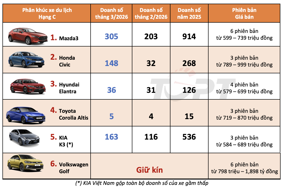 Mazda3 tiếp tục duy trì sức hút để đứng đầu phân khúc xe hạng C trong tháng 3 này với doanh số cao gấp rưỡi tháng trước. Tuy nhiên, Honda Civic mới là mẫu xe tăng trưởng mạnh mẽ nhất trong phân khúc khi đạt tới 148 chiếc, tiếp tục duy trì được vị trí thứ hai quen thuộc từ nhiều tháng trở lại đây, trong khi Hyundai Elantra tăng nhẹ số lượng xe bán ra thị trường và vẫn chỉ xếp thứ ba.