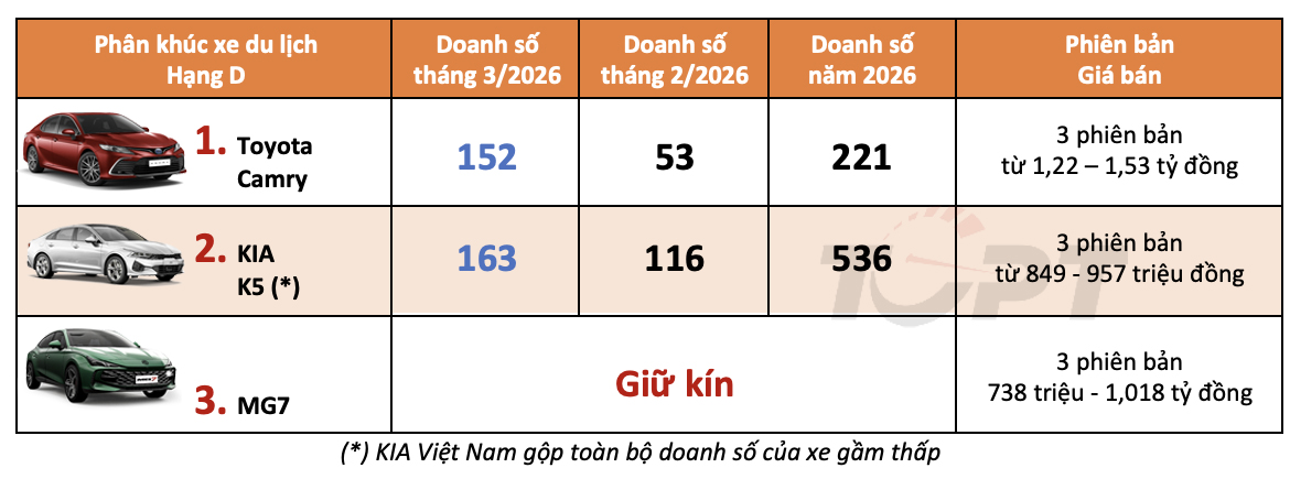 Trong tháng 3, phân khúc xe hạng D vẫn chỉ còn duy nhất Toyota Camry công bố doanh số chi tiết, với 152 chiếc bán ra, nhiều gấp gần 3 lần so với tháng trước đó. Hiện phân khúc này không còn nhiều đổi thủ cạnh tranh tại Việt Nam khi thị hiếu người tiêu dùng đã chuyển sang xe gầm cao.