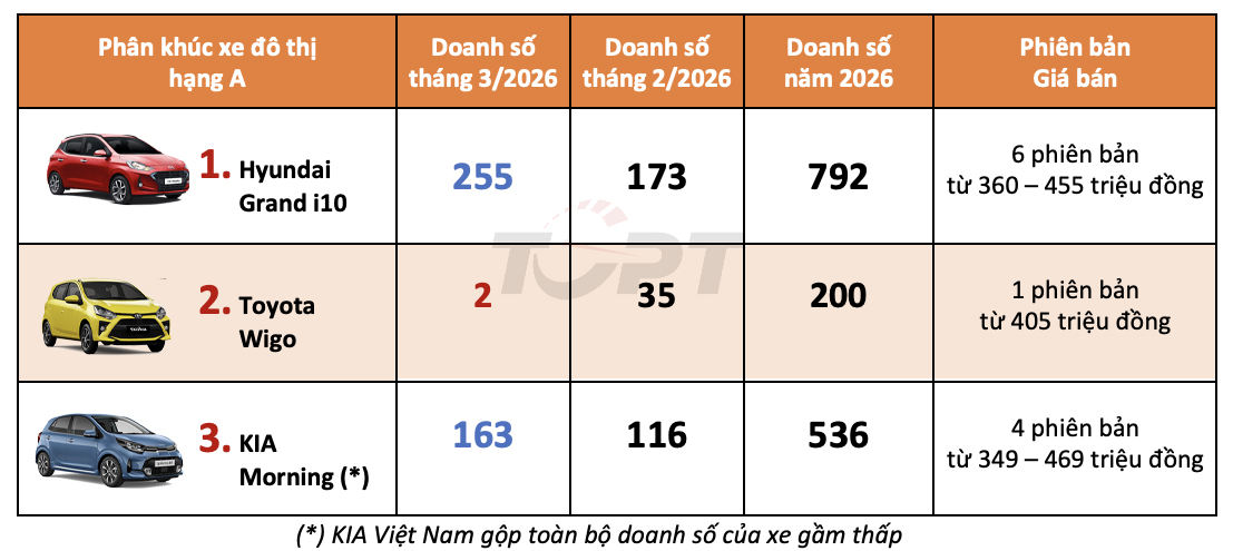 Trong tháng 3, phân khúc xe hạng A đã có một bất ngờ lớn nhưng không làm thay đổi thứ hạng. Theo đó, Toyota Wigo đã bất ngờ giảm mạnh doanh số khi chỉ đạt 2 chiếc dù tháng trước đó có số lượng bán ra tới 35 chiếc, vấn đề này được cho do ảnh hưởng từ nguồn cung từ Indonesia. Hyundai Grand i10 tiếp tục dẫn đầu phân khúc với số lượng bán ra tăng trưởng tốt, đạt 255 chiếc.
