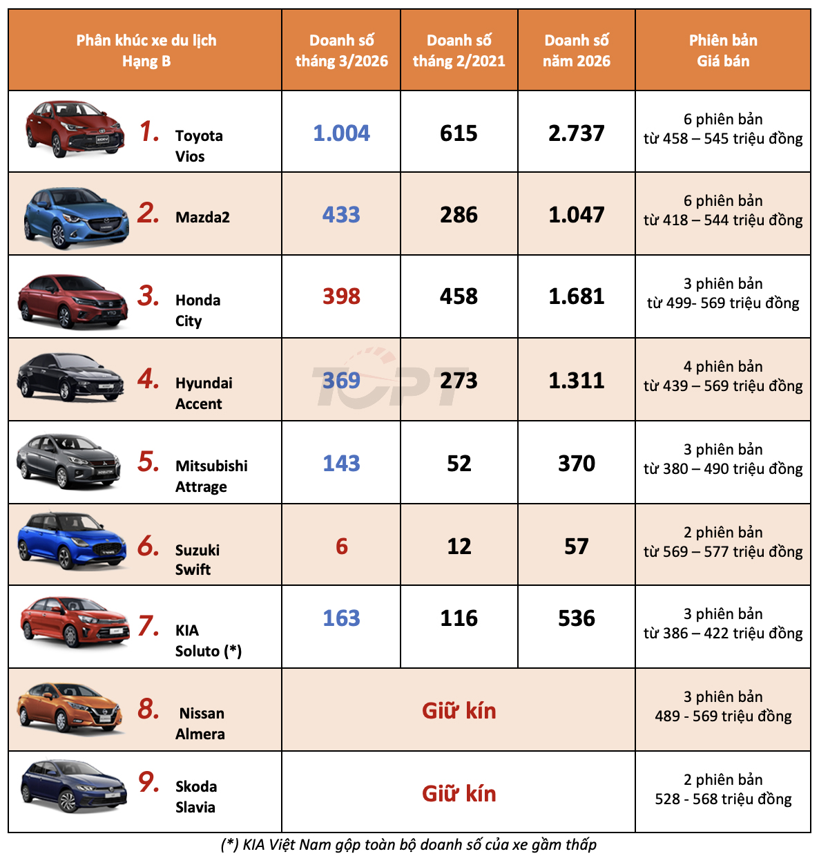 Phân khúc xe hạng B tiếp tục được dẫn đầu bởi Toyota Vios với doanh số tăng trưởng mạnh, và là đại diện duy nhất vượt trên 1.000 chiếc bán ra thị trường trong tháng 3. Trong khi đó, Honda City đã không thể duy trì được doanh số và tụt xuống vị trí thứ ba trong danh sách này, trở thành một trong những mẫu xe hiếm hoi sụt giảm số lượng bán ra.