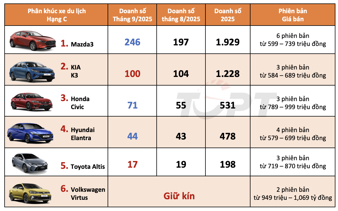 Trong tháng 9, phân khúc xe hạng C không có thay đổi gì về vị trí, với việc Mazda3 tiếp tục thống trị với mức tăng trưởng khá tốt so với tháng trước. Với 246 chiếc bán ra thị trường, mẫu sedan này đã đạt tổng doanh số 1.929 chiếc sau ba quý đầu năm, đảm bảo vị trí dẫn đầu.