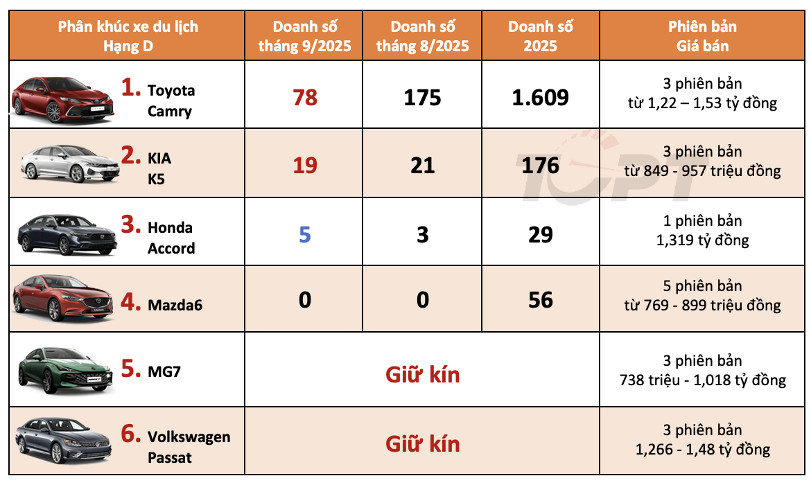 Trong tháng 9/2025, phân khúc xe hạng C và hạng D tiếp tục duy trì tình trạng ổn định... cho đầy đủ. Đáng chú ý nhất là việc Toyota Camry sụt giảm doanh số khá mạnh.