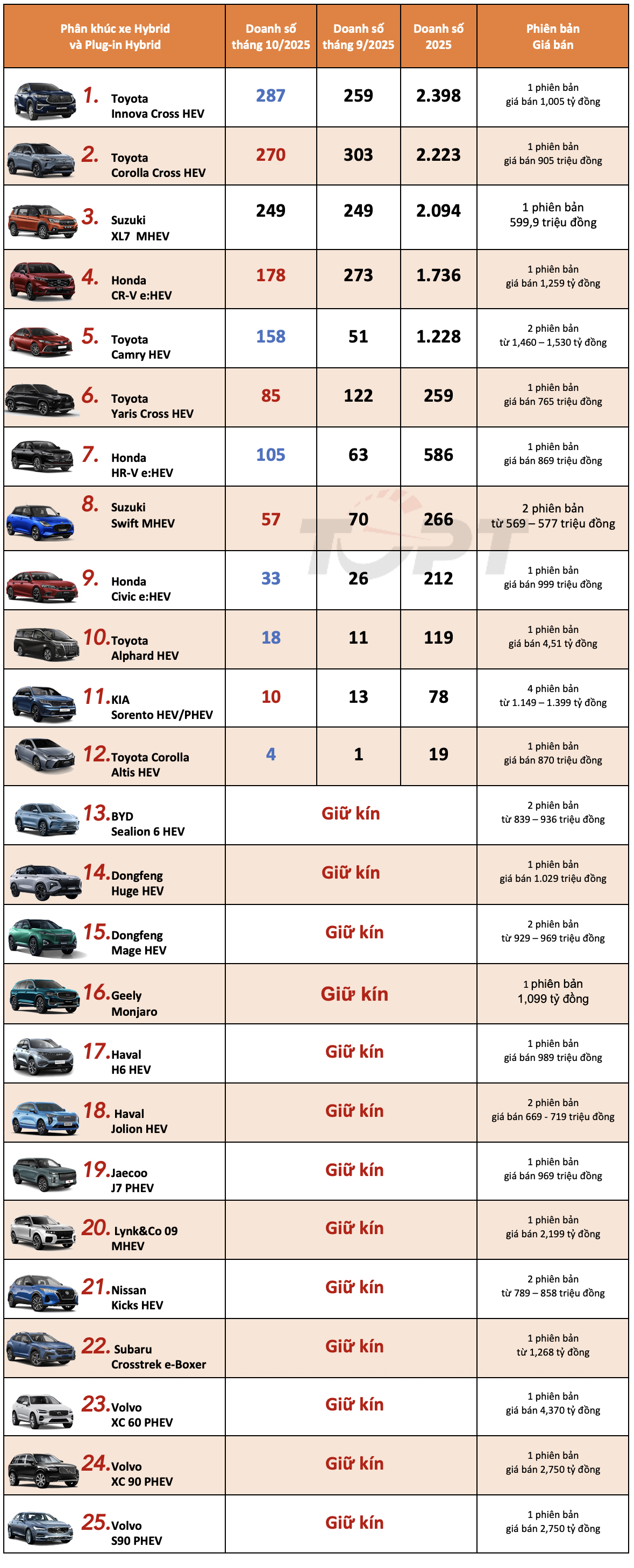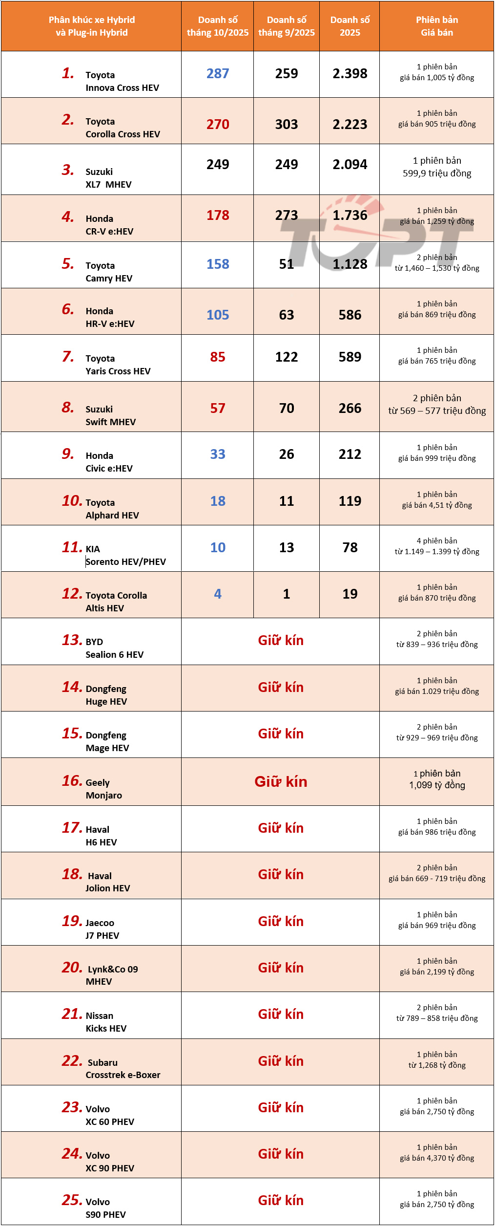 Danh sách xếp hạng phân khúc xe Hybrid tại Việt Nam trong tháng 10/2025 theo thống kê từ VAMA: