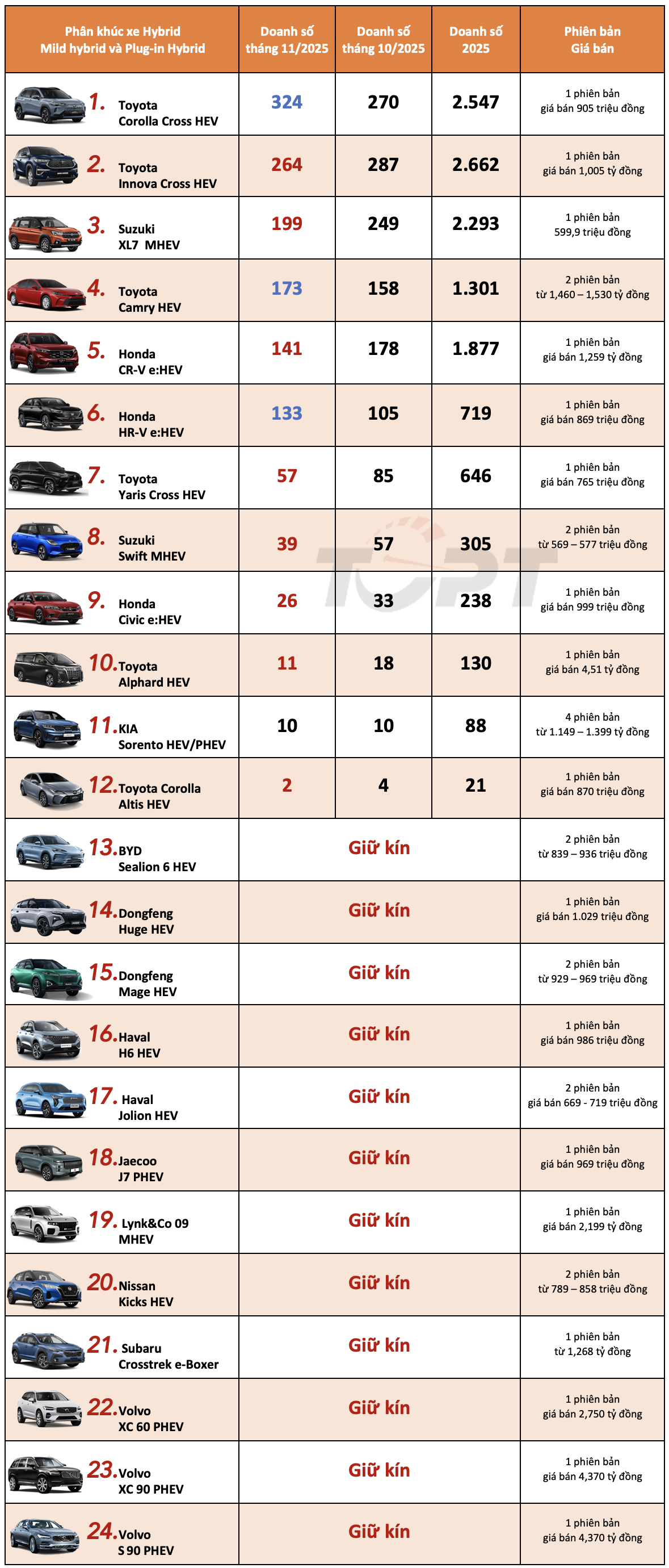 Danh sách xếp hạng phân khúc xe Hybrid tại Việt Nam trong tháng 11/2025 theo thống kê từ VAMA: