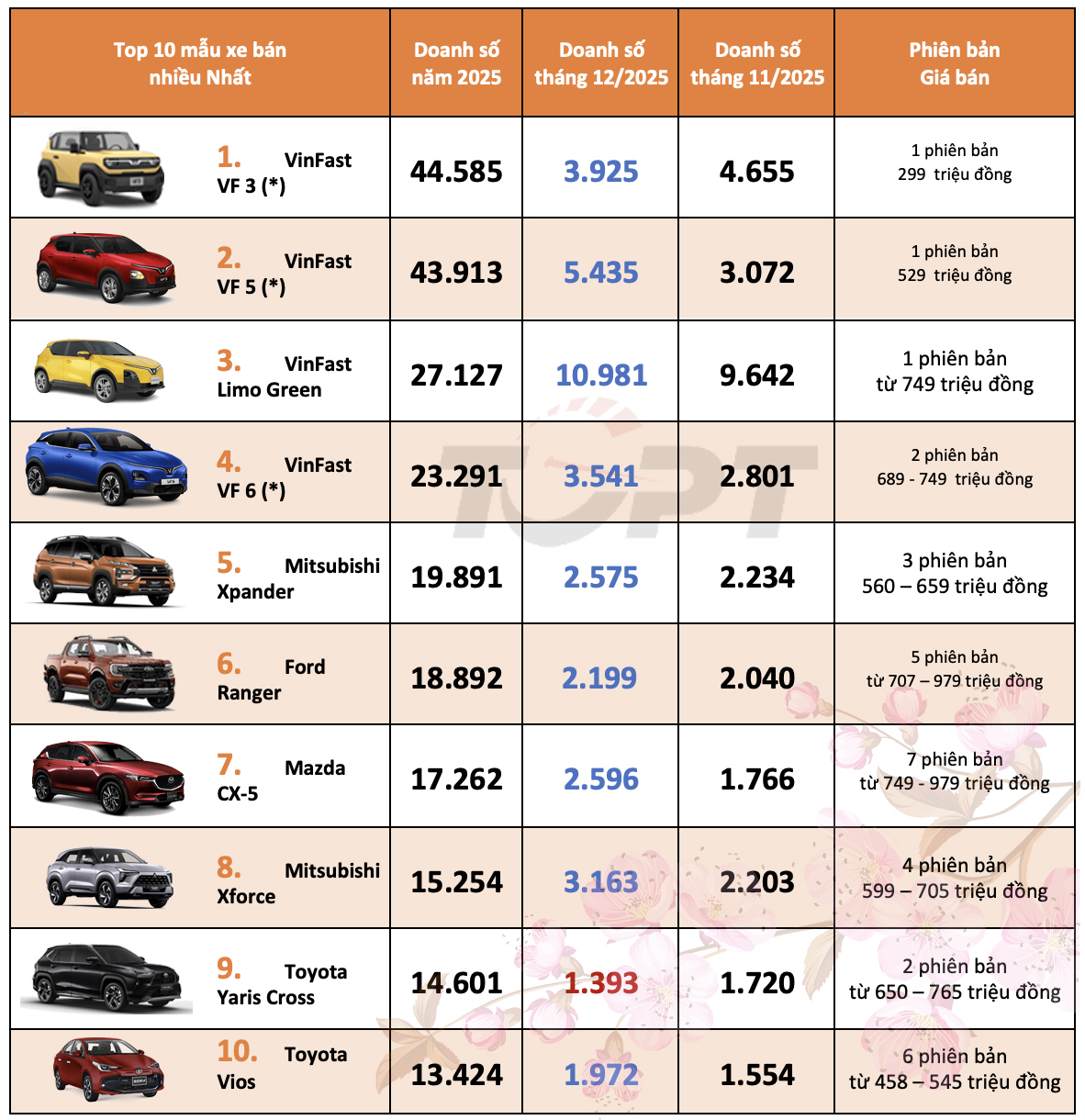 Top 10 mẫu xe bán nhiều nhất trong năm 2025 theo thống kê của VAMA, VinFast và Hyundai Thành Công Việt Nam (HTV):