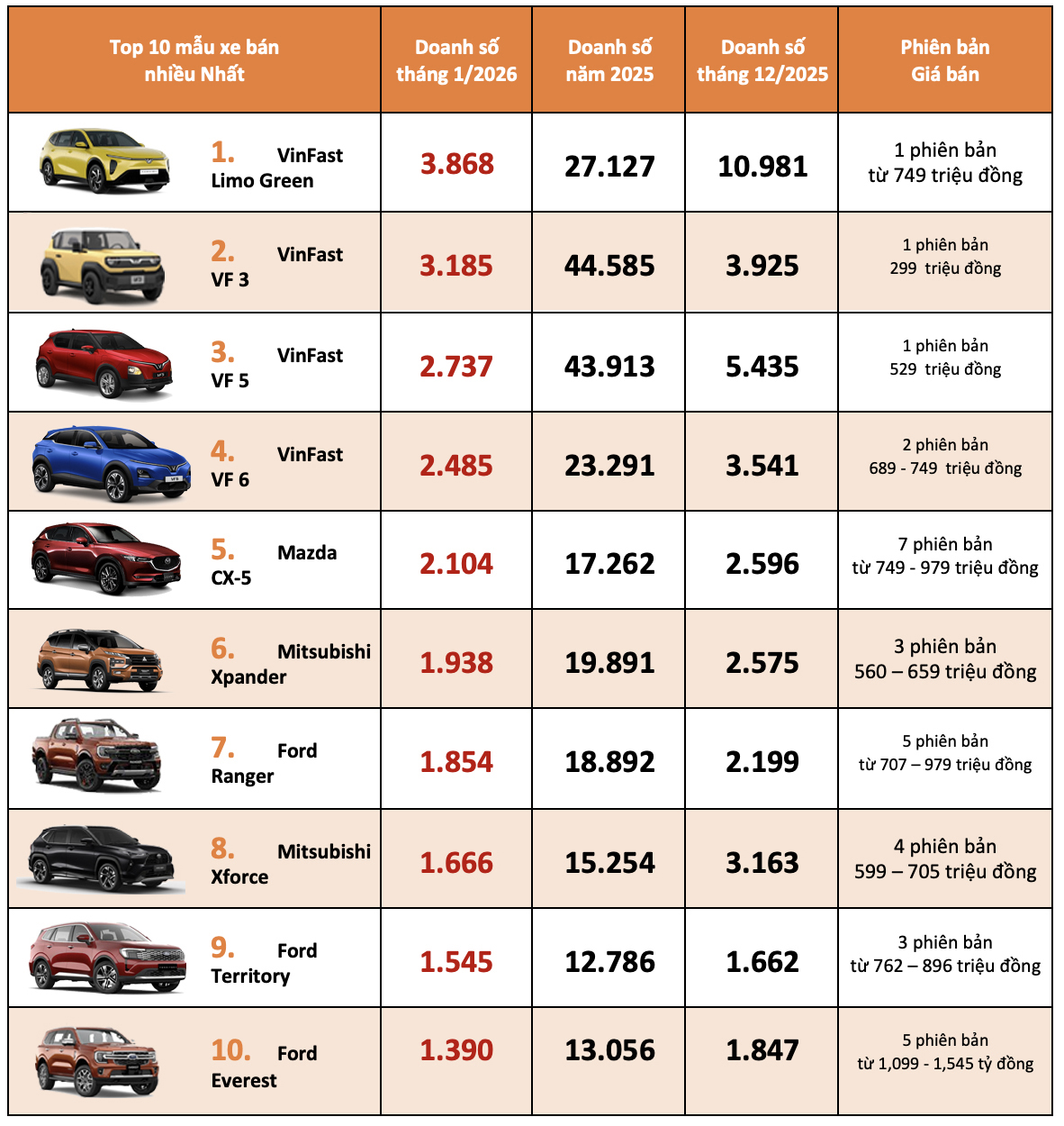 Bên cạnh 4 mẫu xe VinFast, số lượng ô tô Ford chiếm khá nhiều trong bảng xếp hạng top 10 của tháng đầu năm 2026 với 3 đại diện, trong khi Mitsubishi có 2 đại diện và Mazda có duy nhất 1 mẫu CX-5. Đáng chú ý khi không xuất hiện mẫu xe nào của Toyota hay Hyundai trong danh sách này.