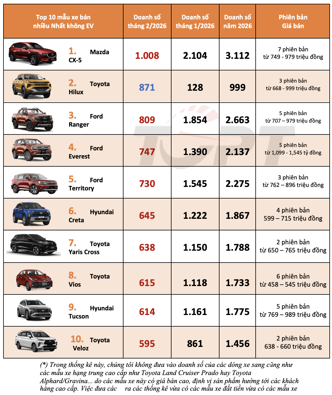 Thị trường ô tô Việt Nam: Top 10 mẫu xe bán nhiều nhất tháng 2/2026 - Xe điện rút lui khỏi danh sách, Mazda CX-5 độc chiếm vị trí số 1