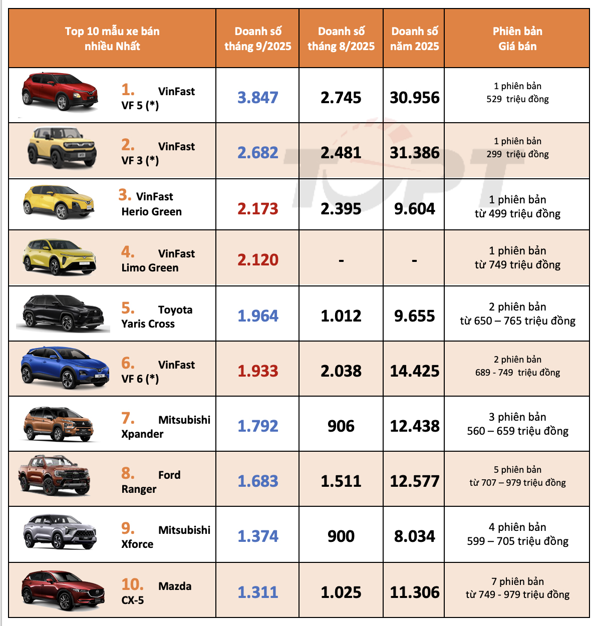 VinFast VF 5 tiếp tục dẫn đầu về doanh số tại thị trường Việt Nam trong tháng 9/2025.