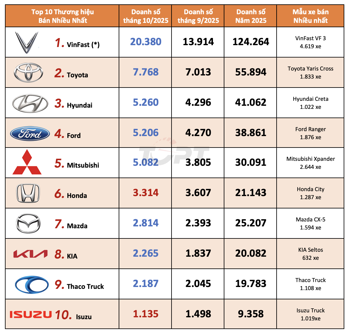 Doanh số các thương hiệu ô tô tại Việt Nam trong tháng 10/2025 theo số liệu của VAMA, VinFast và Hyundai Thành Công Việt Nam: