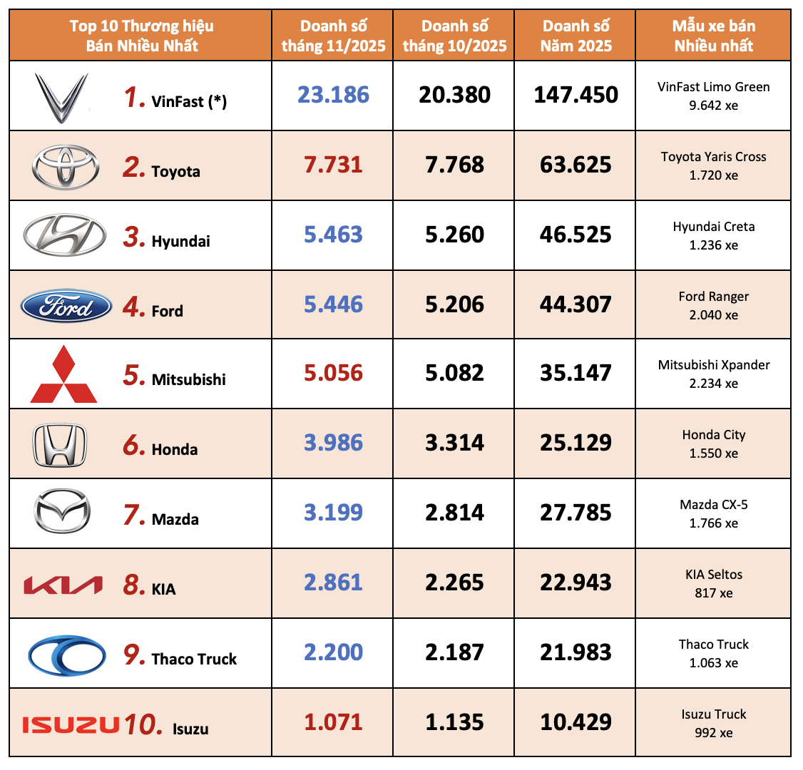 Trong tháng 11, VinFast dẫn đầu danh sách thương hiệu bán nhiều xe nhất với số lượng áp đảo, đạt 23.183 chiếc bán ra thị trường, cao gấp 3 lần so với Toyota ở vị trí tiếp theo - Hãng xe Nhật Bản giảm nhẹ doanh số với 7.731 chiếc nhưng vẫn an toàn khi các đối thủ chưa thể vươn lên.