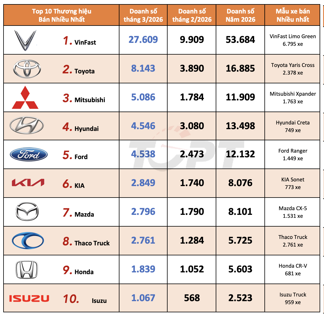 Thị trường ô tô Việt Nam: Top 10 thương hiệu bán nhiều xe nhất tháng 3/2026
