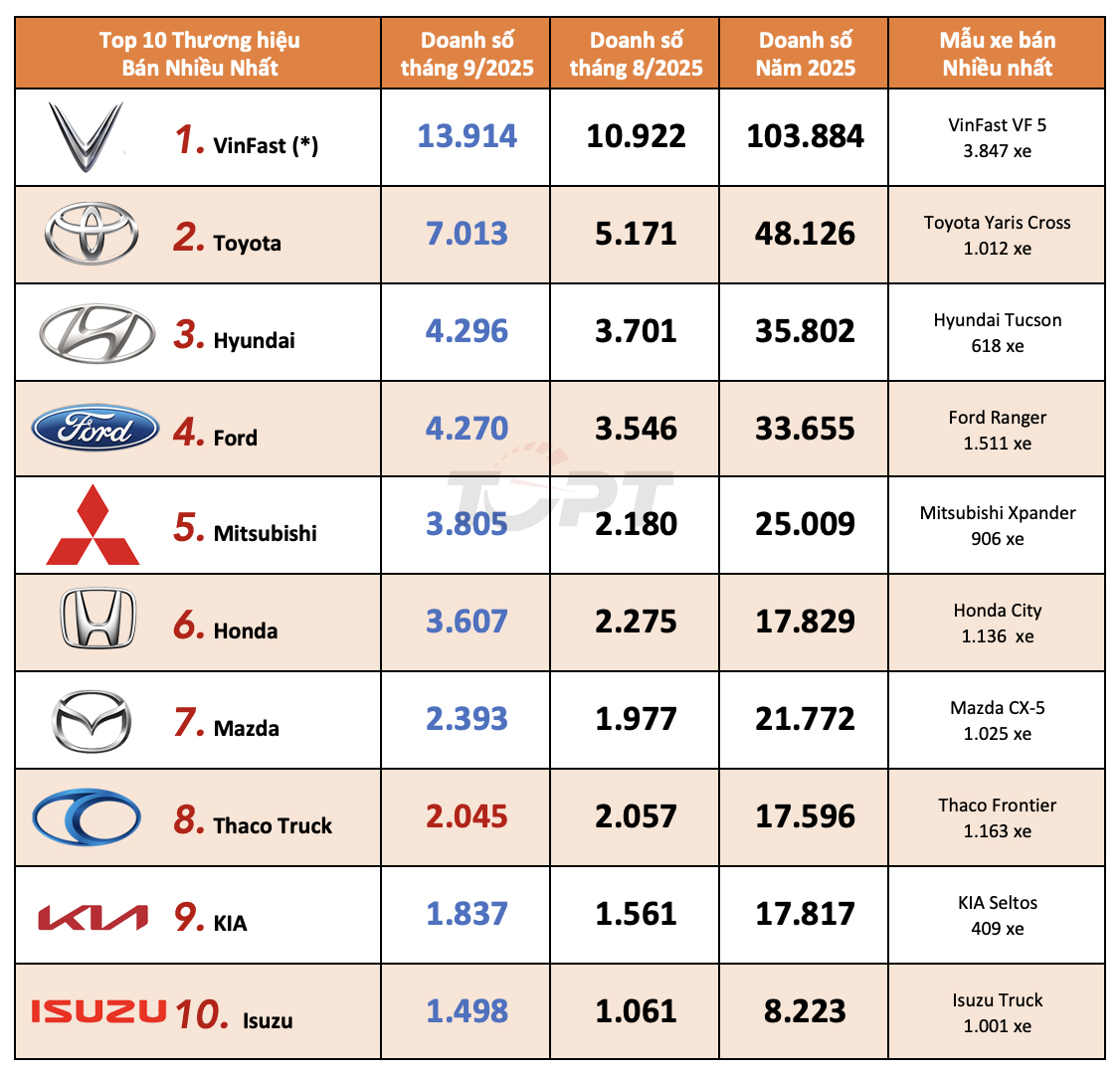 Tương tự các tháng trước, VinFast tiếp tục dẫn đầu về doanh số trong bảng xếp hạng top 10 thương hiệu trong tháng 9/2025, với 13.914 chiếc đã bán ra tại Việt Nam và cũng trở thành hãng xe đầu tiên vượt mốc doanh số 100.000 chiếc ô tô trong năm 2025.