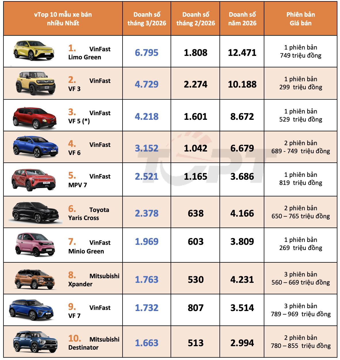 Ngoài ra, các mẫu xe sử dụng động cơ đốt trong còn lại thuộc top 10 cũng có khác biệt, khi không còn mẫu xe nào của tháng còn hiện diện trong danh sách, ba đại diện mới góp mặt gồm: Toyota Yaris Cross, Mitsubishi Xpander và Destinator.