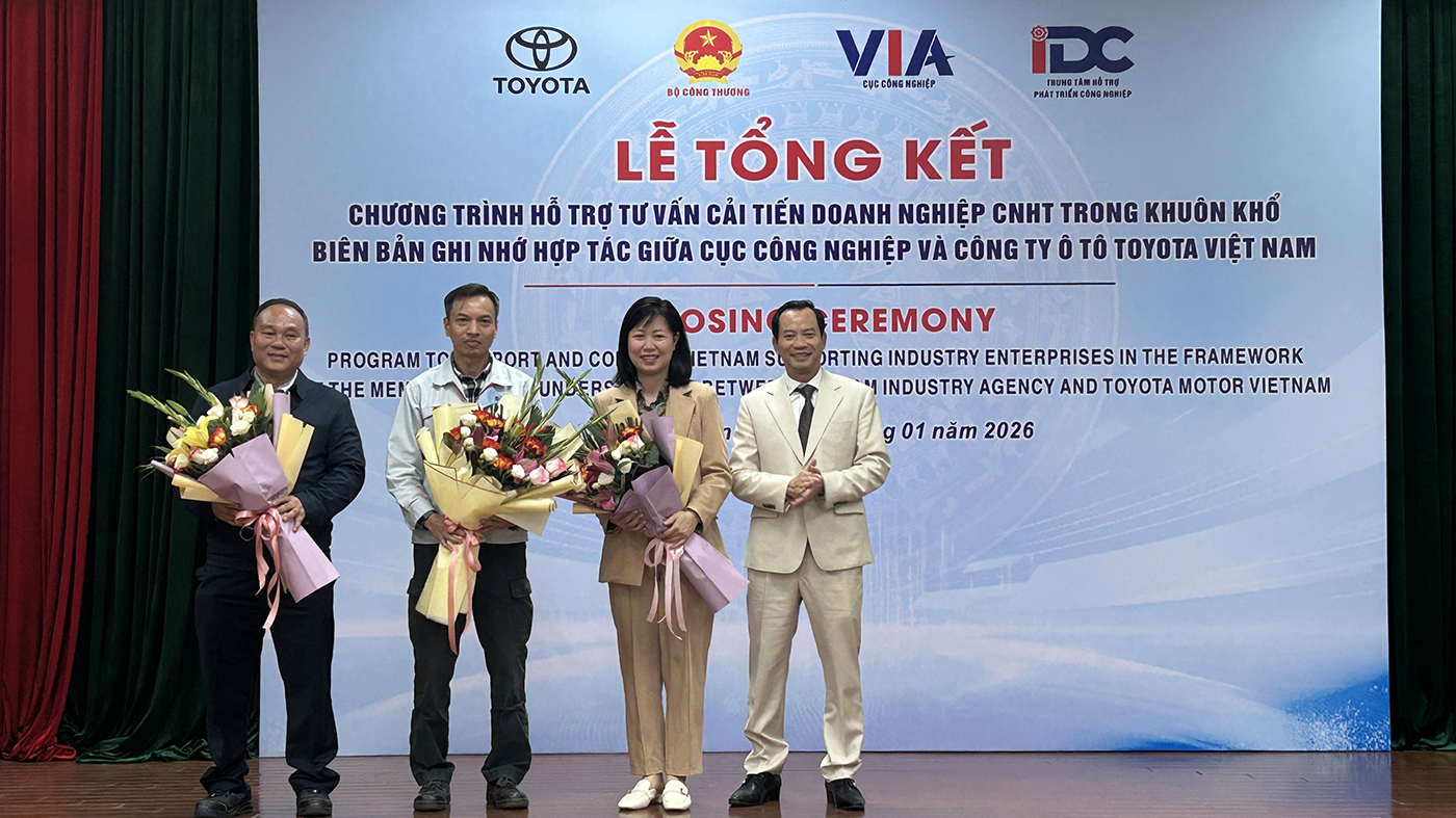 Toyota Việt Nam phối hợp cùng Cục Công nghiệp (Bộ Công Thương) đã tổ chức Lễ Tổng kết hoạt động hỗ trợ tư vấn cải tiến doanh nghiệp công nghiệp hỗ trợ năm 2025. Đây là dấu mốc quan trọng trong năm thứ 6 của dự án hợp tác chiến lược nhằm nâng cao năng lực cho các nhà cung cấp nội địa.