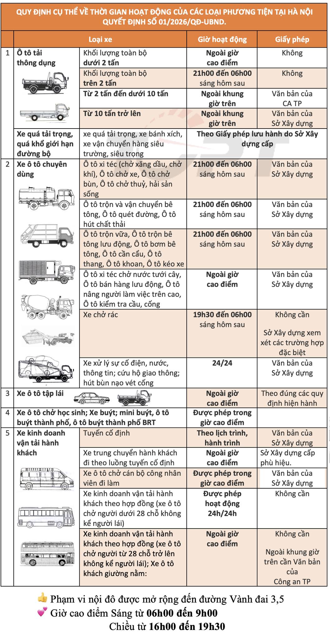 Trước đó, Quyết định số 01/2026/QĐ-UBND của UBND Thành phố Hà Nội đã quy định cấm xe tải có tổng trọng tải từ 2 tấn trở lên hoạt động trong khu vực nội đô vào ban ngày, có hiệu lực thi hành từ ngày 15/1/2026, với phạm vi nội đô được mở rộng đến đường Vành đai 3,5 (trước đây là Vành đai 3) và thời gian cao điểm được xác định từ 6h–9h và 16h–19h30 hằng ngày. Xe tải từ 2 tấn trở lên chỉ được phép lưu thông trong khung giờ từ 21h đến 6h sáng hôm sau.